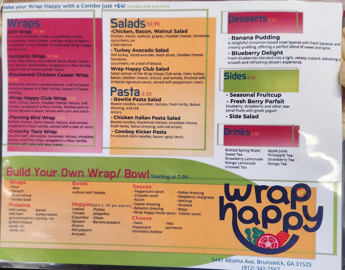 Welcome to Wrap Happy, a culinary gem nestled in the heart of Brunswick, GA. Located at 5441 Altama Ave, this bustling eatery specializes in creating vibrant, flavor-packed wraps that are sure to elevate your lunch experience. With a tagline that resonates with joy, Wrap Happy aims to bring smiles to its patrons through delicious meals paired with exceptional service.